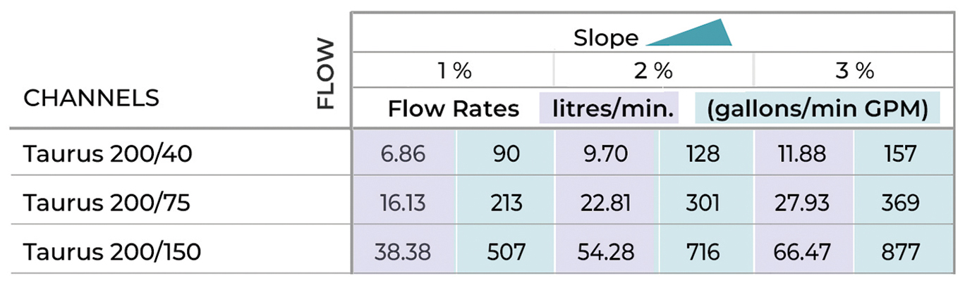 Lateral outlet diameters are 50, 63mm (2, 2½"), bottom outlet diameters are 110, 140mm (4⅓, 5½"). When this Taurus Channel is configured with reinforcing edge rails it should be matched with the POZ95-1317 profile to allow loads up to D400.